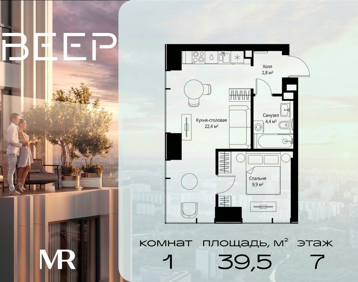 Продаётся 1-комнатная квартира общей площадью 39.50 м² без отделки в ЖК Веер на 7-м этаже 46 этажного дома.