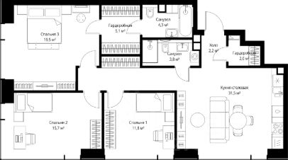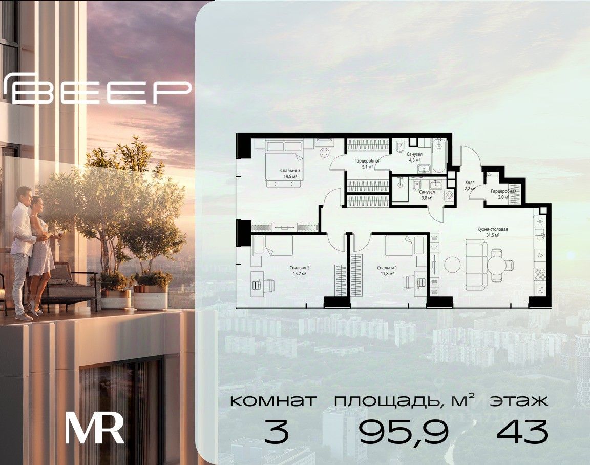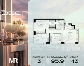 Продаётся 3-комнатная квартира общей площадью 95.90 м² с предчистовой отделкой в ЖК Веер на 43-м этаже 46 этажного дома.