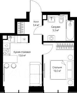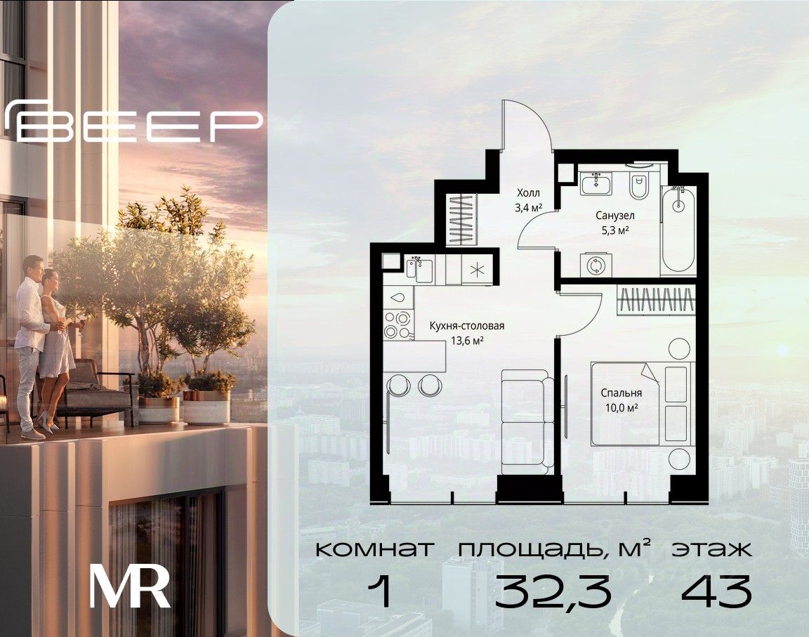 Продаётся 1-комнатная квартира общей площадью 32.30 м² с предчистовой отделкой в ЖК Веер на 43-м этаже 46 этажного дома.