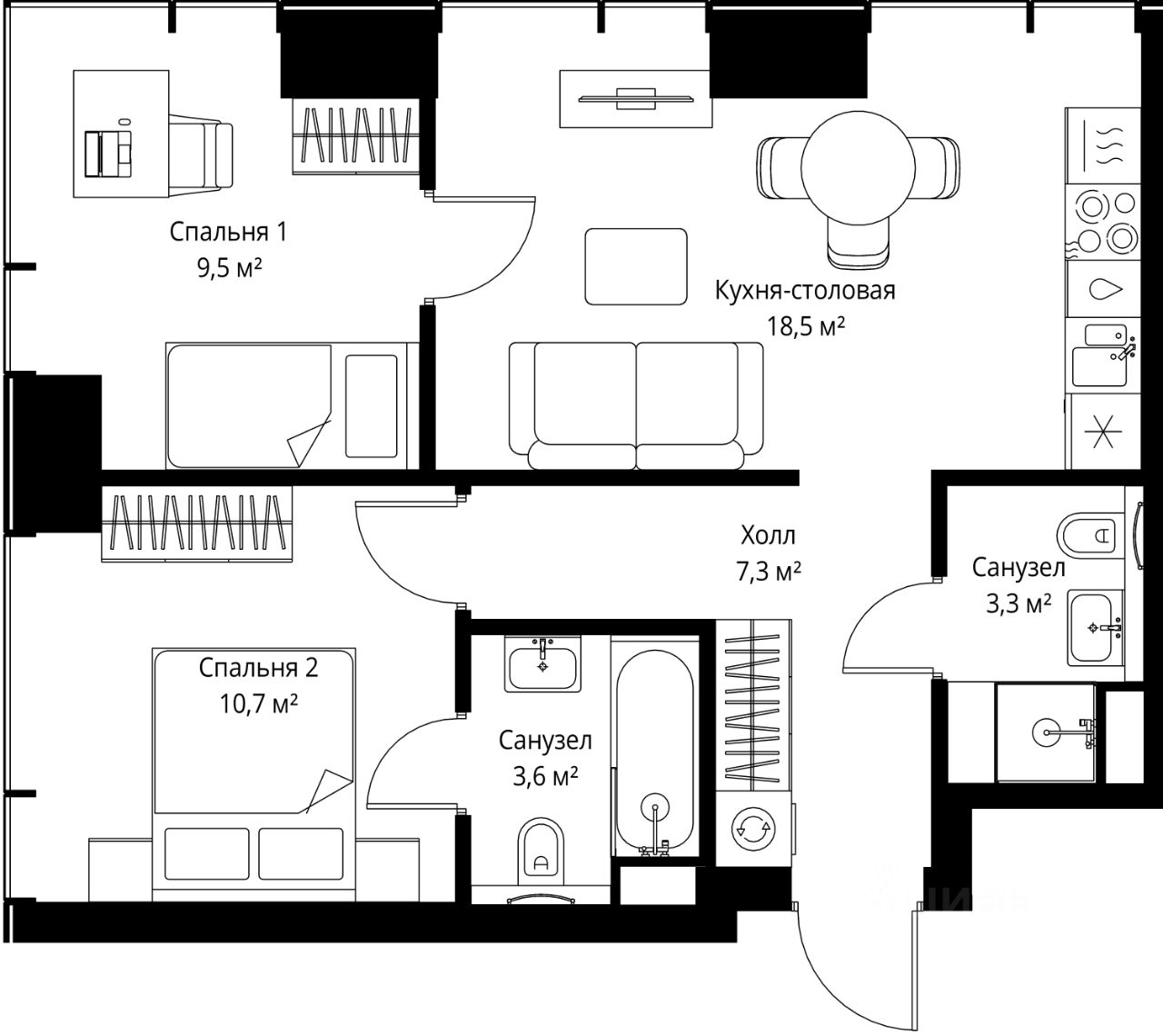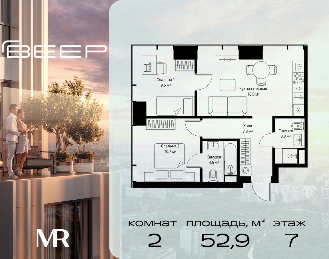 Продаётся 2-комнатная квартира общей площадью 52.90 м² с предчистовой отделкой в ЖК Веер на 7-м этаже 46 этажного дома.
