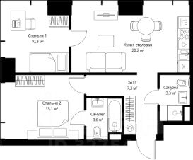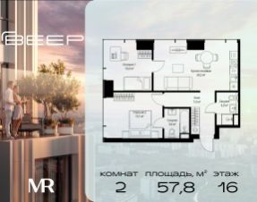 Продаётся 2-комнатная квартира общей площадью 57.80 м² с предчистовой отделкой в ЖК Веер на 16-м этаже 46 этажного дома.