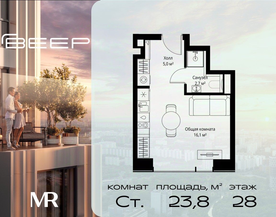 Продаётся студия общей площадью 23.80 м² с предчистовой отделкой в ЖК Веер на 28-м этаже 46 этажного дома.