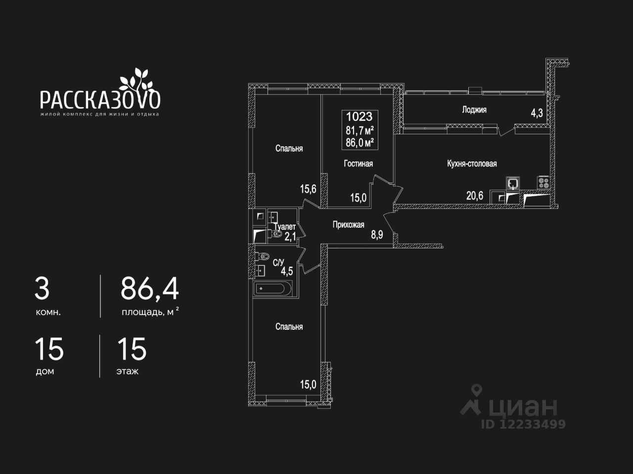 Продается 3-комнатная квартира в ЖК Рассказово на 15 этаже. Общая площадь квартиры составляет 86,4 кв.м. Квартира без отделки.