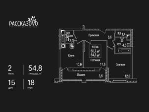 Продается 2-комнатная квартира в ЖК Рассказово на 18 этаже. Общая площадь квартиры составляет 54,8 кв.м. Квартира без отделки.