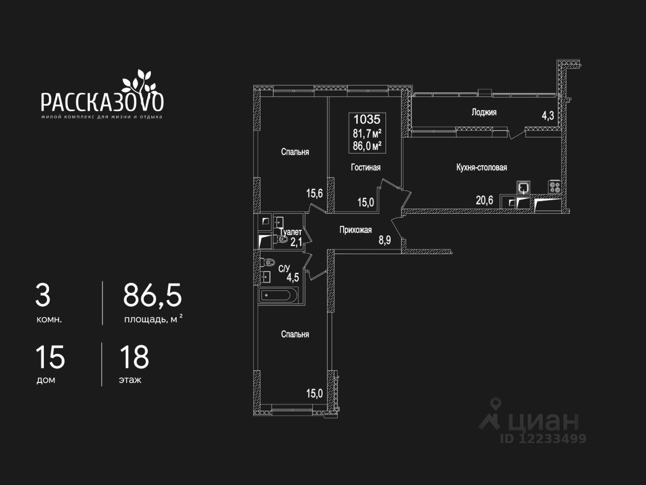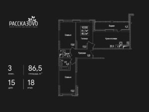 Продается 3-комнатная квартира в ЖК Рассказово на 18 этаже. Общая площадь квартиры составляет 86,5 кв.м. Квартира без отделки.