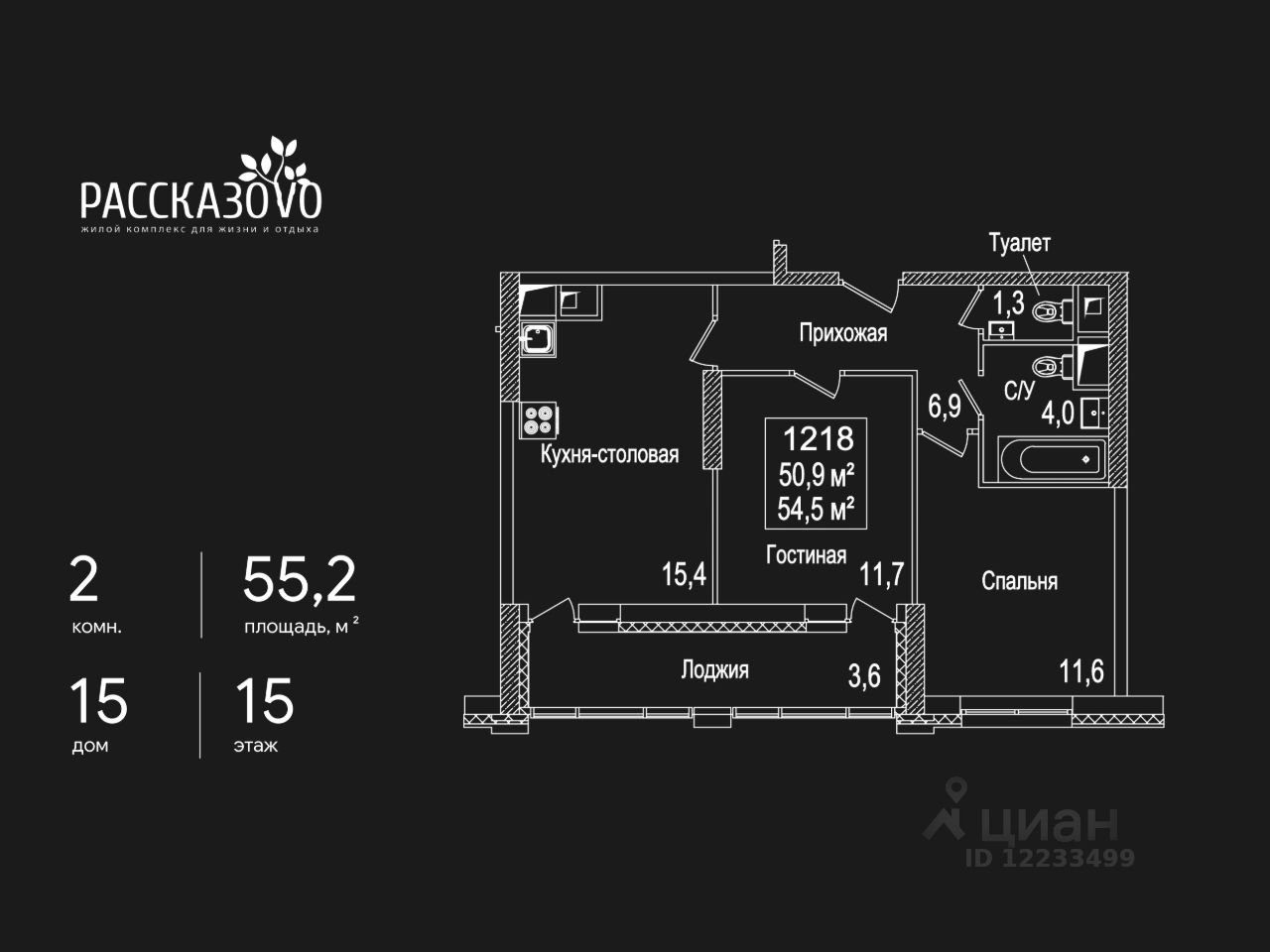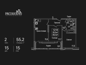 Продается 2-комнатная квартира в ЖК Рассказово на 15 этаже. Общая площадь квартиры составляет 55,2 кв.м. Квартира без отделки.