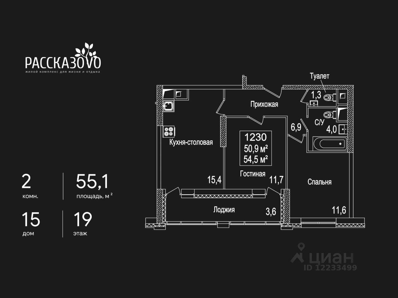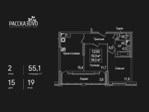 Продается 2-комнатная квартира в ЖК Рассказово на 19 этаже. Общая площадь квартиры составляет 55,1 кв.м. Квартира без отделки.