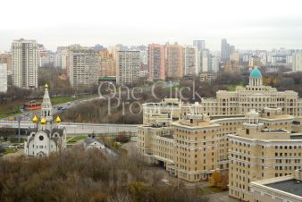 малоэтажный корпус на фоне стеклянных свечек