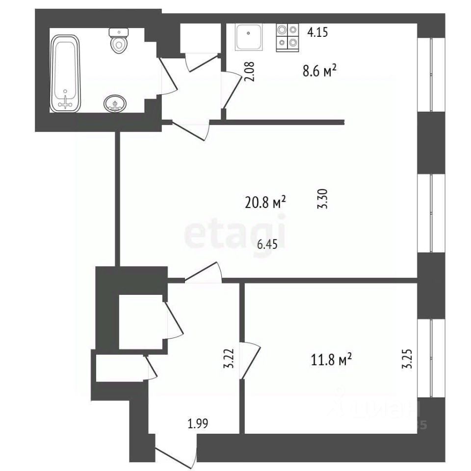 Площадь: 54,2 кв. м (кухня-гостиная 30 м + изолированная спальня 12 м).