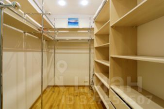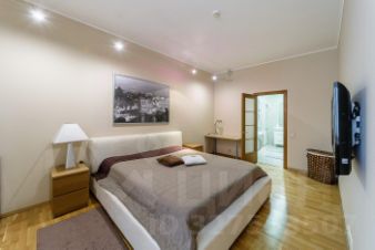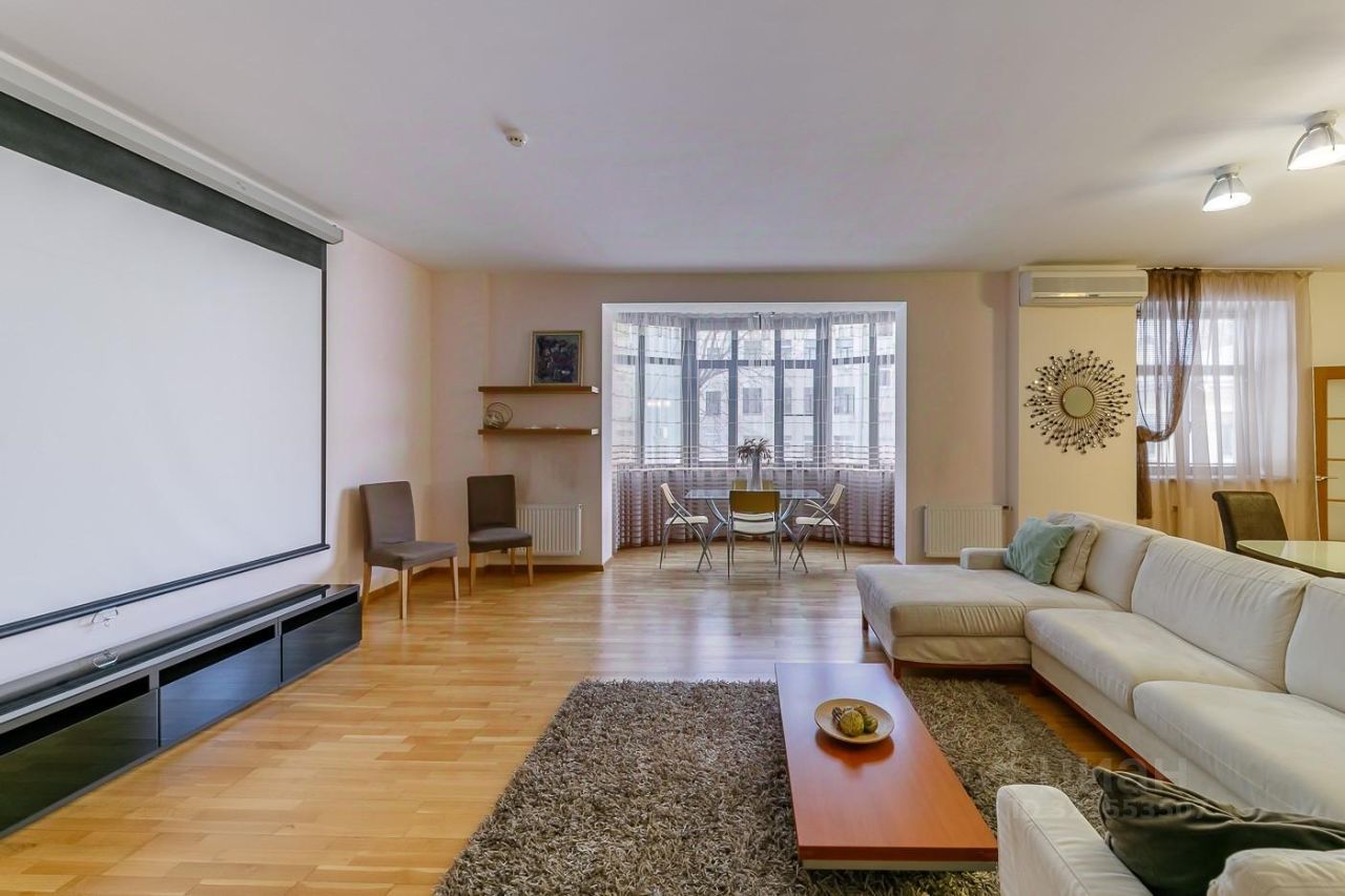 Квартира включает в себя: изолированную спальню, гостиную с проектором и обеденным столом, кухню, два санузла, отдельную гардеробную комнату.