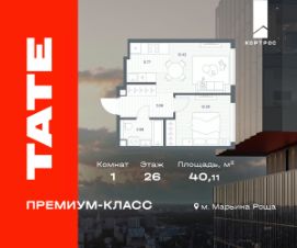 Продается 1-к квартира общей площадью 40.11 м2 с предчистовой отделкой в ЖК премиум-класса ТАТЕ на 26-м этаже 49-этажной башни А.