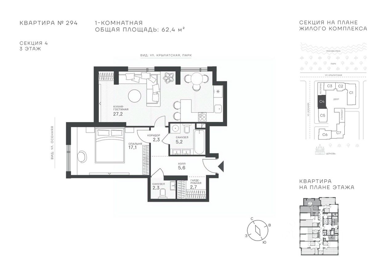 Продается 1-к квартира площадью 62.4 кв.м. на 3-м этаже в ЖК "Клубный квартал Крылатская 33". Прямая продажа от застройщика!