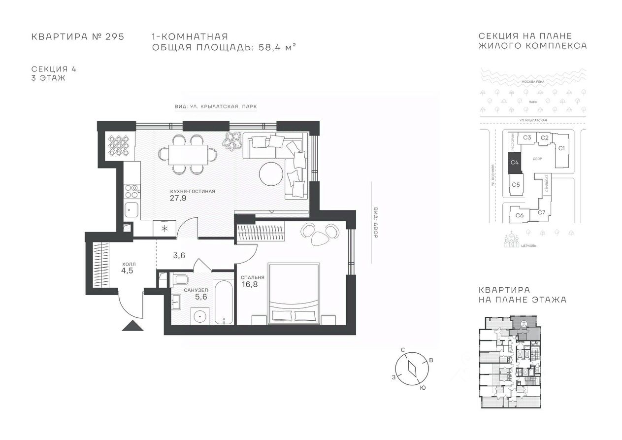 Продается 1-к квартира площадью 58.4 кв.м. на 3-м этаже в ЖК "Клубный квартал Крылатская 33". Прямая продажа от застройщика!