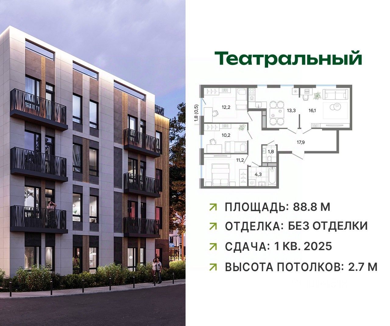 В современном квартале бизнес-класса ЖК Театральный продаётся 4-комнатная квартира, общей площадью 88.8 кв.м, расположенная на 3 этаже (корпус 1, секция 10).