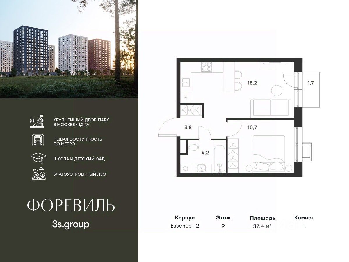 Предчистовая отделка в подарок! Пешая доступность от метро и московская прописка! Продается уютная 1-комн. квартира площадью 37,4 кв.м на 9 этаже 17 этажного жилого комплекса бизнес-класса Foreville от 3S Group.