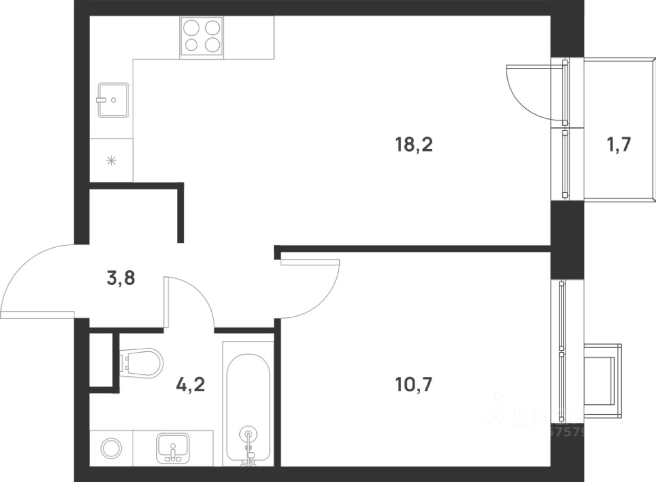 Общая площадь: 37,4 кв.м., жилая: 22,3 кв.м., площадь кухни-гостиной: 18,2 кв.м., высота потолков: 2,72 м., окна выходят на улицу.