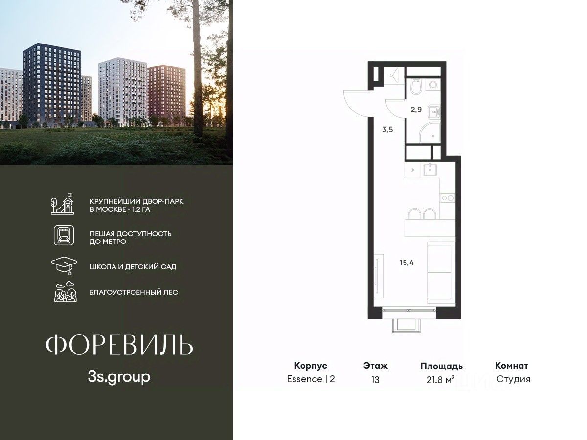 Предчистовая отделка в подарок! Пешая доступность от метро и московская прописка! Продается уютная студия площадью 21,8 кв.м на 13 этаже 17 этажного жилого комплекса бизнес-класса Foreville от 3S Group.