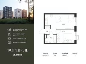 Продается уютная 1-комн. квартира площадью 37,6 кв.м на 15 этаже 17 этажного жилого комплекса бизнес-класса Foreville от 3S Group.
