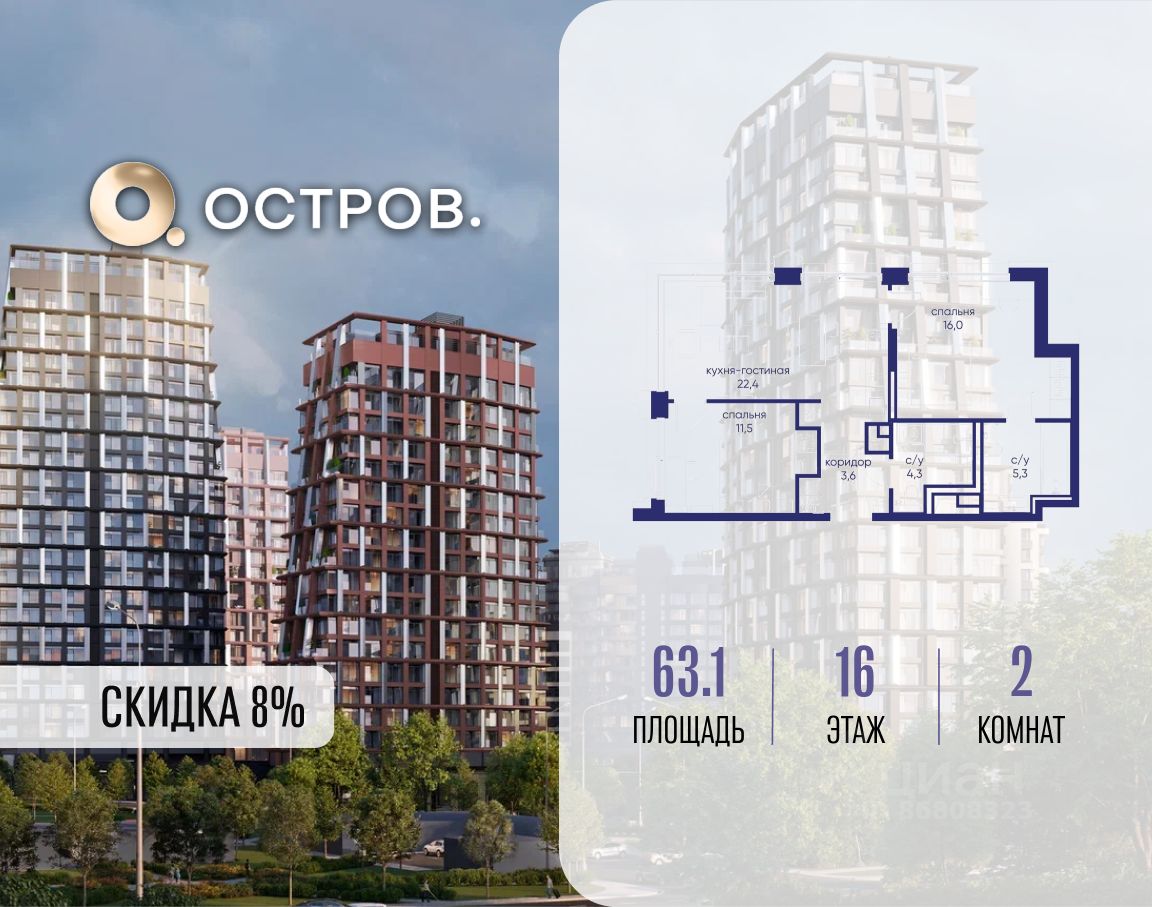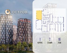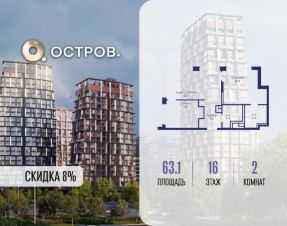 Продаётся 2-комн. квартира от застройщика: общая площадь 63.10 м², жилая 27.50 м², кухня 22.40 м², 16-й этаж, жилой квартал "Остров 14", корпус 1 (секция 2). Срок сдачи: 2 квартал 2029 года.