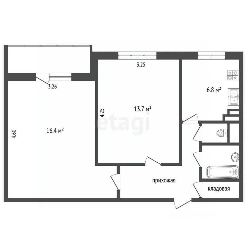 Площадь: 47 м2 (жилая — 30,1 м2, кухня — 7 м2).