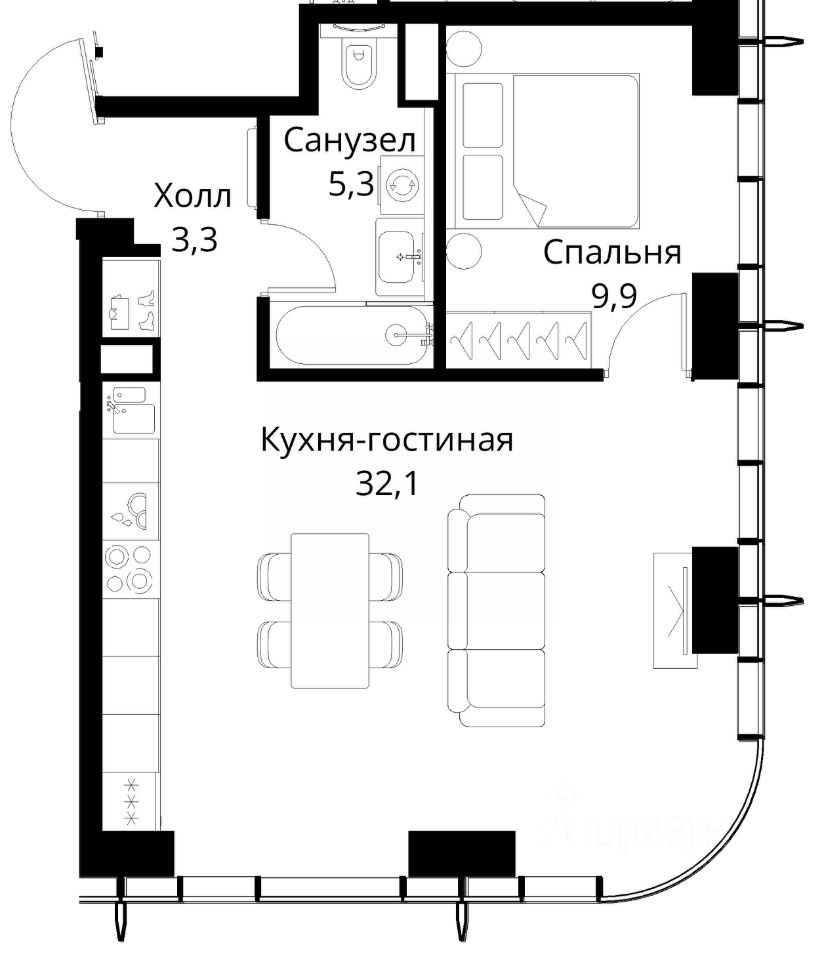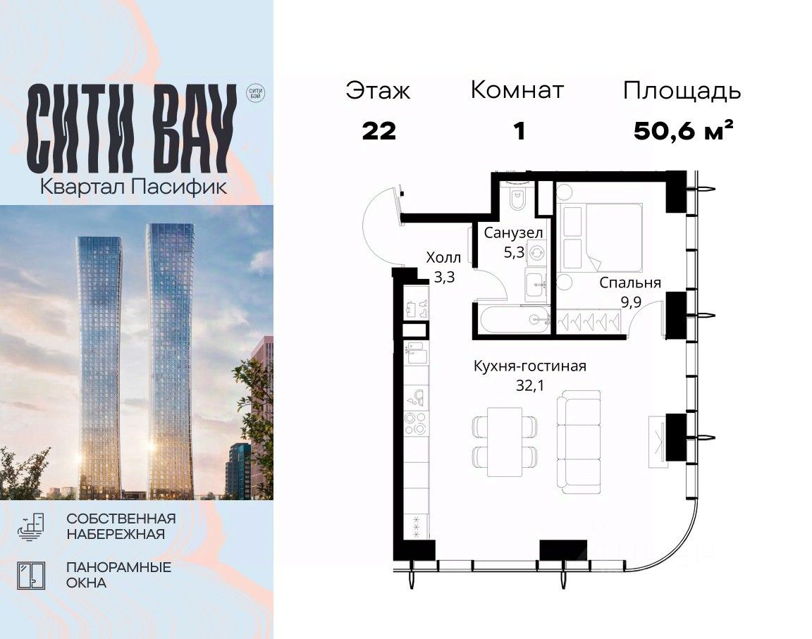 Продаётся 1-комнатная квартира общей площадью 50.60 м² без отделки в ЖК Сити Бэй, квартале Пасифик, на 22-м этаже 59 этажного дома.