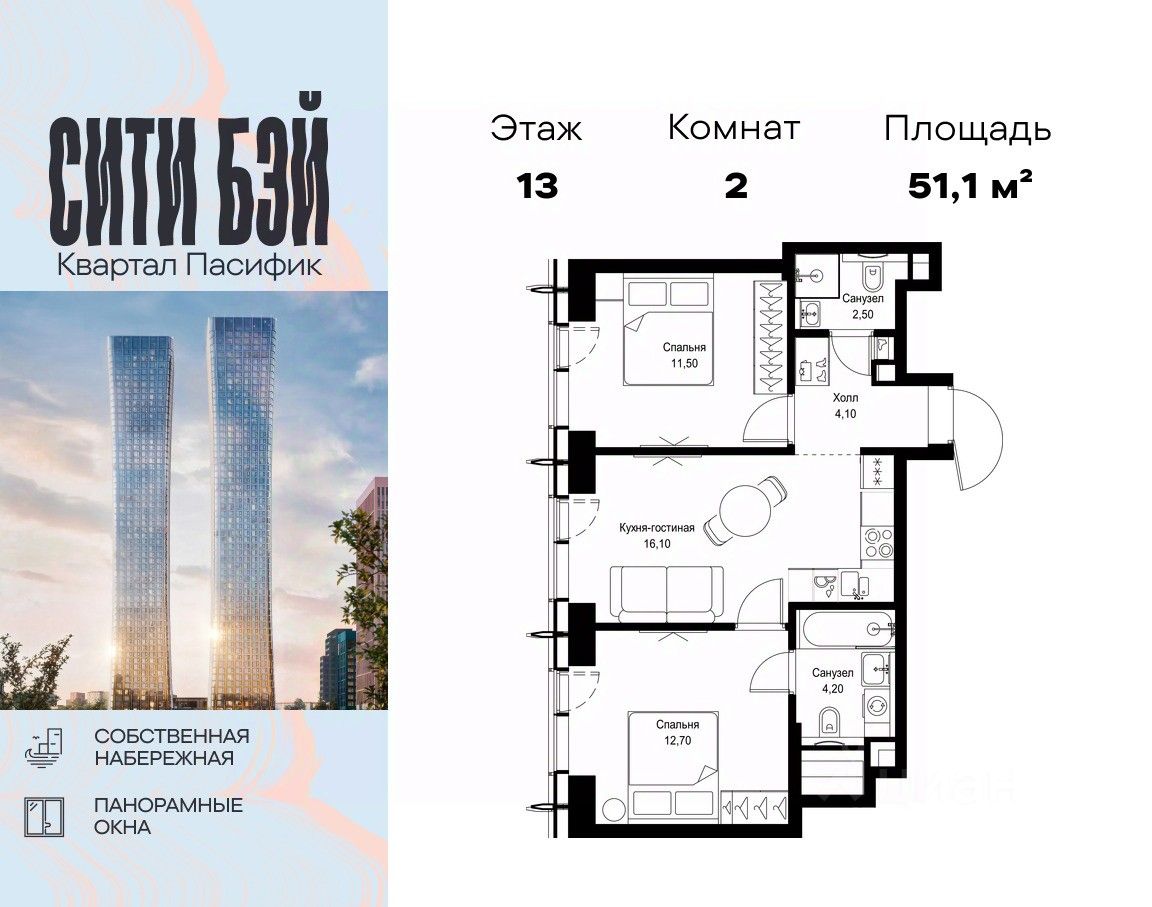 Продаётся 2-комнатная квартира общей площадью 51.10 м² без отделки в ЖК Сити Бэй, квартале Пасифик, на 13-м этаже 59 этажного дома.