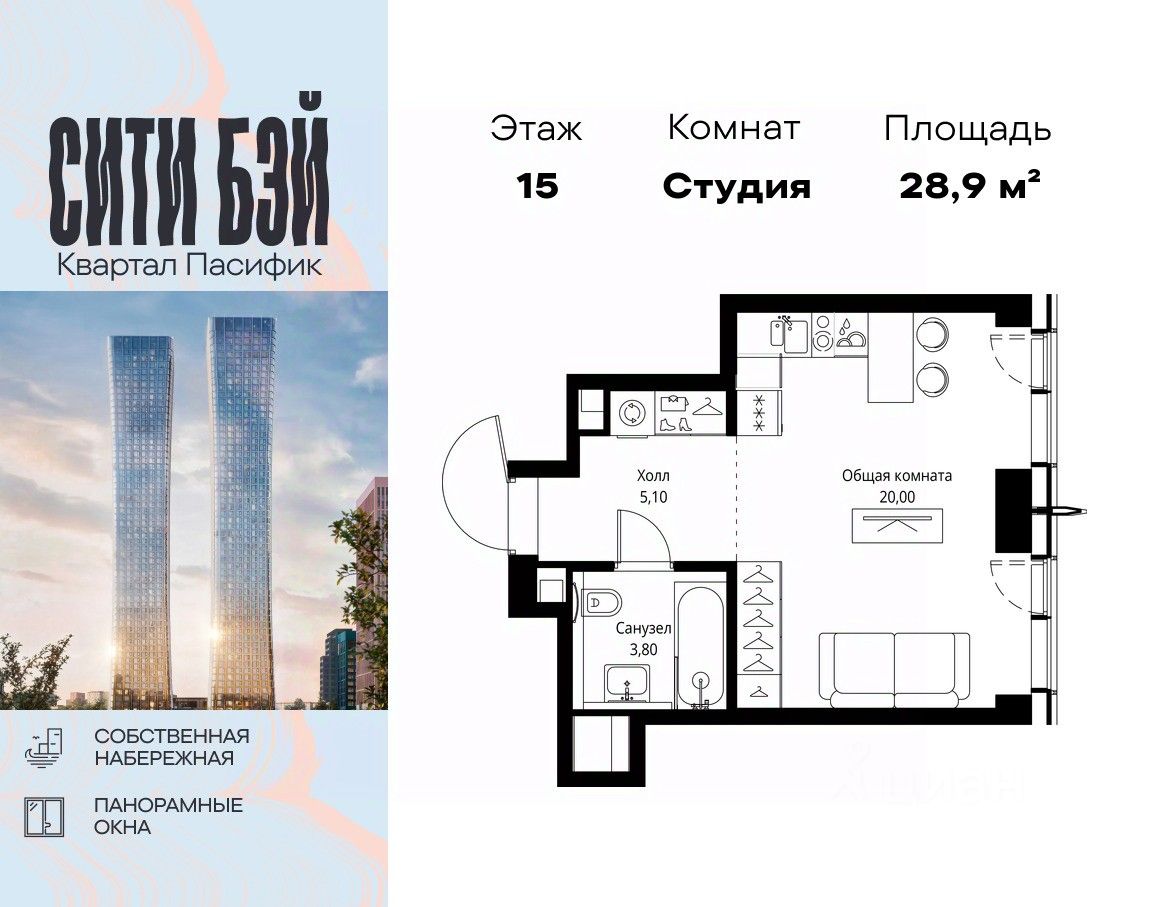 Продаётся студия общей площадью 28.90 м² без отделки в ЖК Сити Бэй, квартале Пасифик, на 15-м этаже 59 этажного дома.