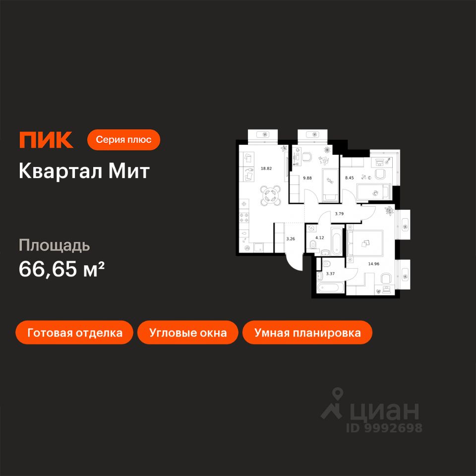 Продаётся 3-комн. квартира площадью 66,65 кв.м на 22 этаже 26 этажного дома (Корпус 3.2, Секция 2) проекта ПИК Квартал Мит. Светлый просторный подъезд на уровне земли, функциональная планировка, большие окна, c отделкой.