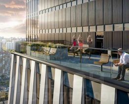 В корпусе 1.4 появится общественная терраса на 30-м этаже. Доступ сюда есть только у жителей, поэтому вы не встретите в этом пространстве посторонних людей. Здесь можно заниматься спортом, отдохнуть за чтением книги или создать собственный сад. А ещё отсюда открываются красивые виды на город.