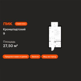 Продаётся квартира-студия площадью 27,5 кв.м на 5 этаже 12 этажного дома (Корпус 1.1.1, Секция 1) проекта ПИК Кронштадтский 9. Светлый просторный подъезд на уровне земли, функциональная планировка, большие окна, предчистовая отделка.