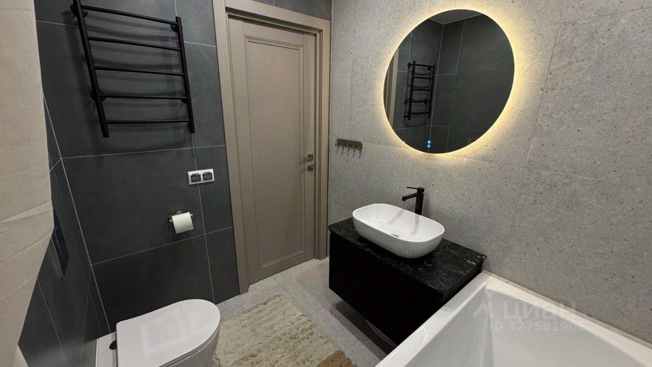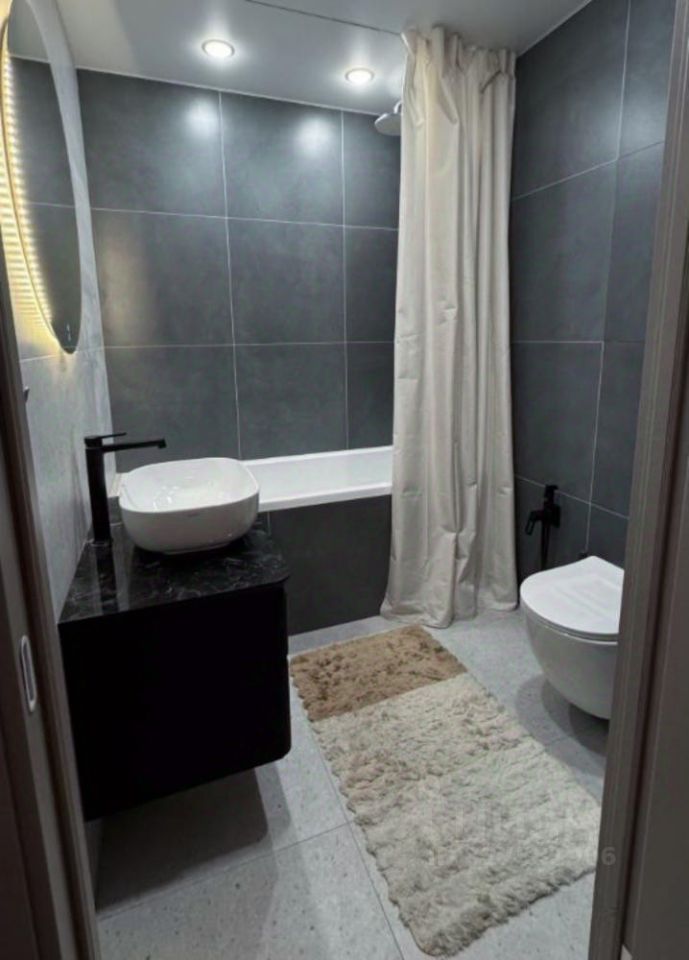 -Раздельный санузел в широкоформатной плитке, установлена качественная сантехника.