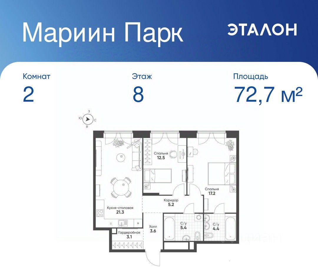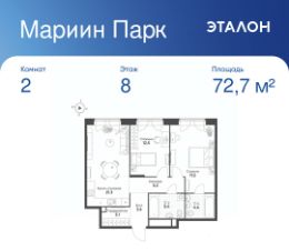 Общая площадь квартиры — 72.7 кв. м, этаж 8 из 16.