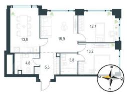 Свобода планировки: Кухня-гостиная 30 м² (можно объединить или разделить) + две изолированные спальни (12.7 и 13.2 м²) + 2 с/у.