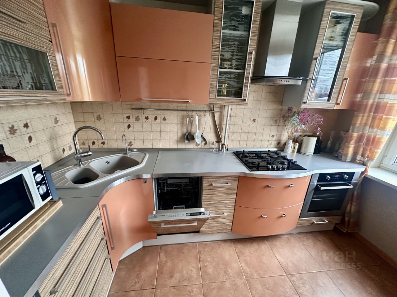 Вместительная кухня со всей необходимой бытовой техникой, в том числе посудомоечной машиной. Большой совмещенный санузел.