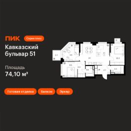 Продаётся 3-комн. квартира площадью 74,1 кв.м на 20 этаже 23 этажного дома (Корпус 3.2, Секция 2) проекта ПИК Кавказский бульвар 51. Светлый просторный подъезд на уровне земли, функциональная планировка, большие окна, c отделкой.