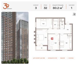 Продается трехкомнатная квартира в ЖК "Проспект 39" по адресу Москва, ЮВАО, Рязанский проспект, вл. 39, к. 2. Общая площадь квартиры - 80,20 кв.м., этаж 32. Стоимость квартиры - 31 283 365 р. Продаётся без отделки.