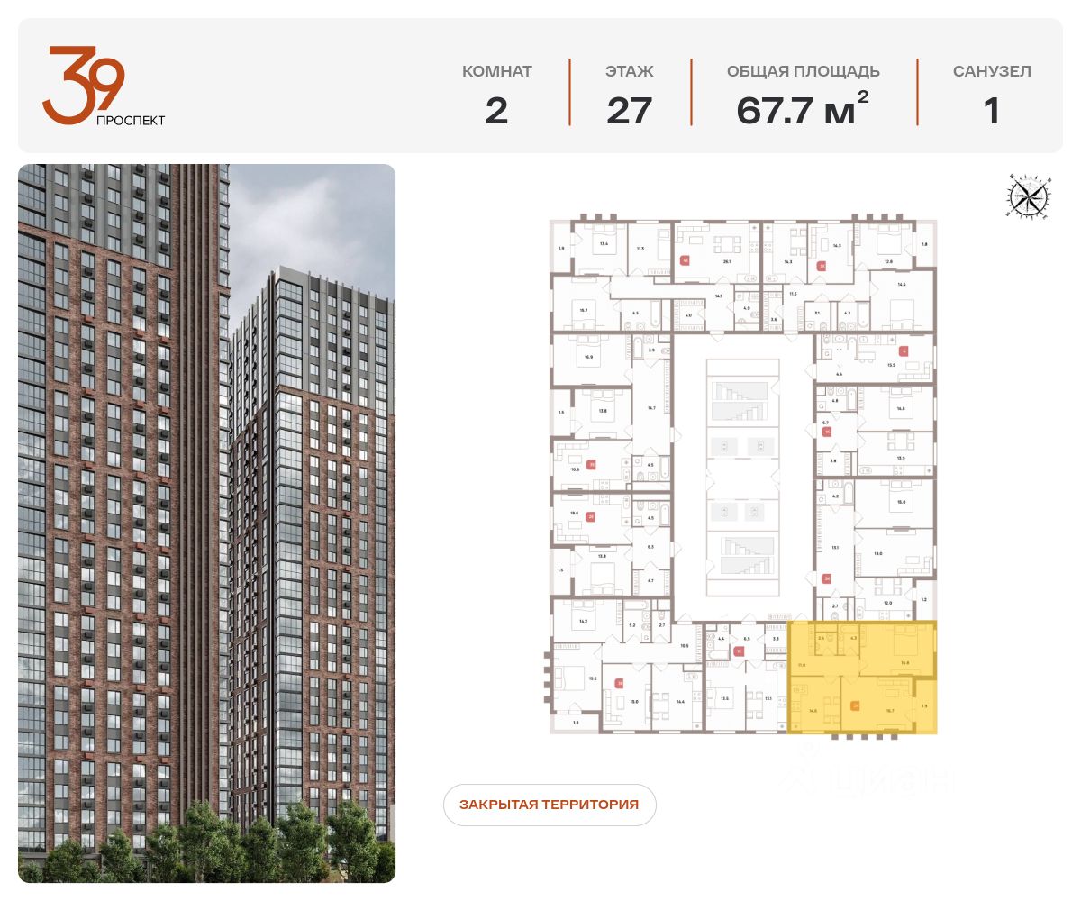 Продается двухкомнатная квартира в ЖК "Проспект 39" по адресу Москва, ЮВАО, Рязанский проспект, вл. 39, к. 1. Общая площадь квартиры - 67,70 кв.м., этаж 28. Стоимость квартиры - 27 498 137 р. Продаётся без отделки.