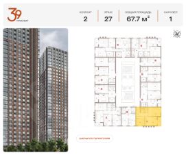 Продается двухкомнатная квартира в ЖК "Проспект 39" по адресу Москва, ЮВАО, Рязанский проспект, вл. 39, к. 1. Общая площадь квартиры - 67,70 кв.м., этаж 31. Стоимость квартиры - 28 027 939 р. Продаётся без отделки.