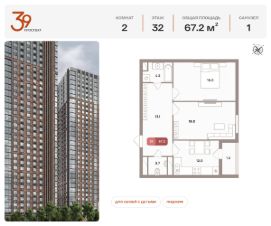 Продается двухкомнатная квартира в ЖК "Проспект 39" по адресу Москва, ЮВАО, Рязанский проспект, вл. 39, к. 1. Общая площадь квартиры - 67,20 кв.м., этаж 32. Стоимость квартиры - 28 589 719 р. Продаётся без отделки.