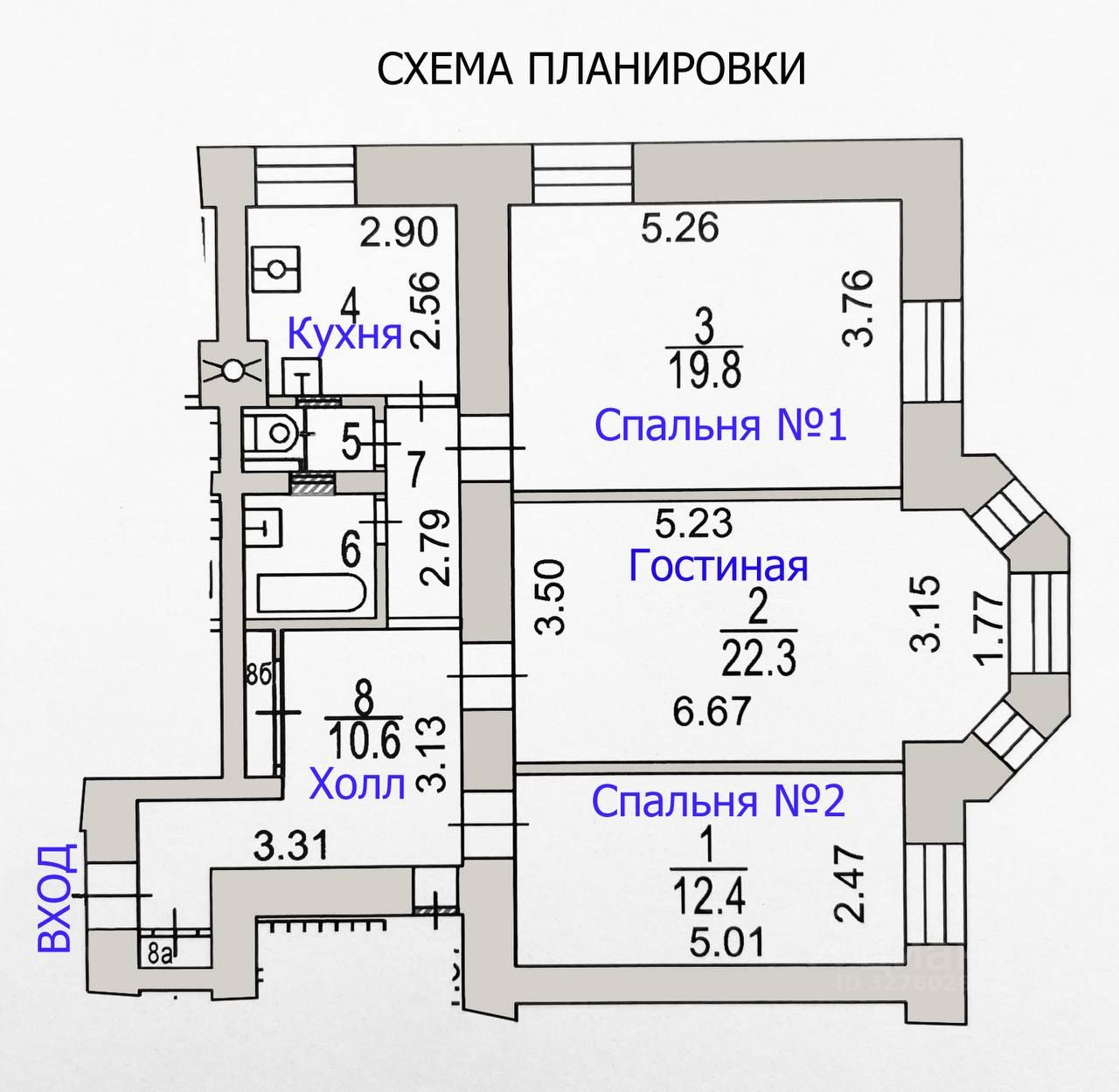 Квартира без перепланировок площадью 80,5 кв. м (изолированные комнаты - 12,4кв м; 19,8кв м; 22,3кв м) очень светлая - окна на две стороны. Гостиная с эркером. В угловой комнате два окна, что позволяет при необходимости разделить ее на две комнаты (квартиры в этом подъезде часто продаются как 4-х комнатные). Также имеется большой квадратный холл (10 кв. м), в котором можно устроить гардеробную.