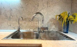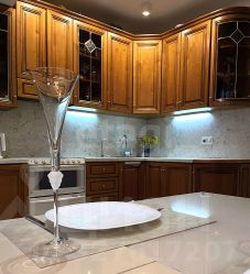Итальянская кухня из массива дерева со встроенным набором Candy TRIO: варочная панель, духовой шкаф и посудомоечная машина, врезная мойка с фильтром для питьевой и ионизированной воды, двухкамерный холодильник Siemens, микроволновая печь Bork, сушильная машина Miele, вытяжка. Пол с подогревом.