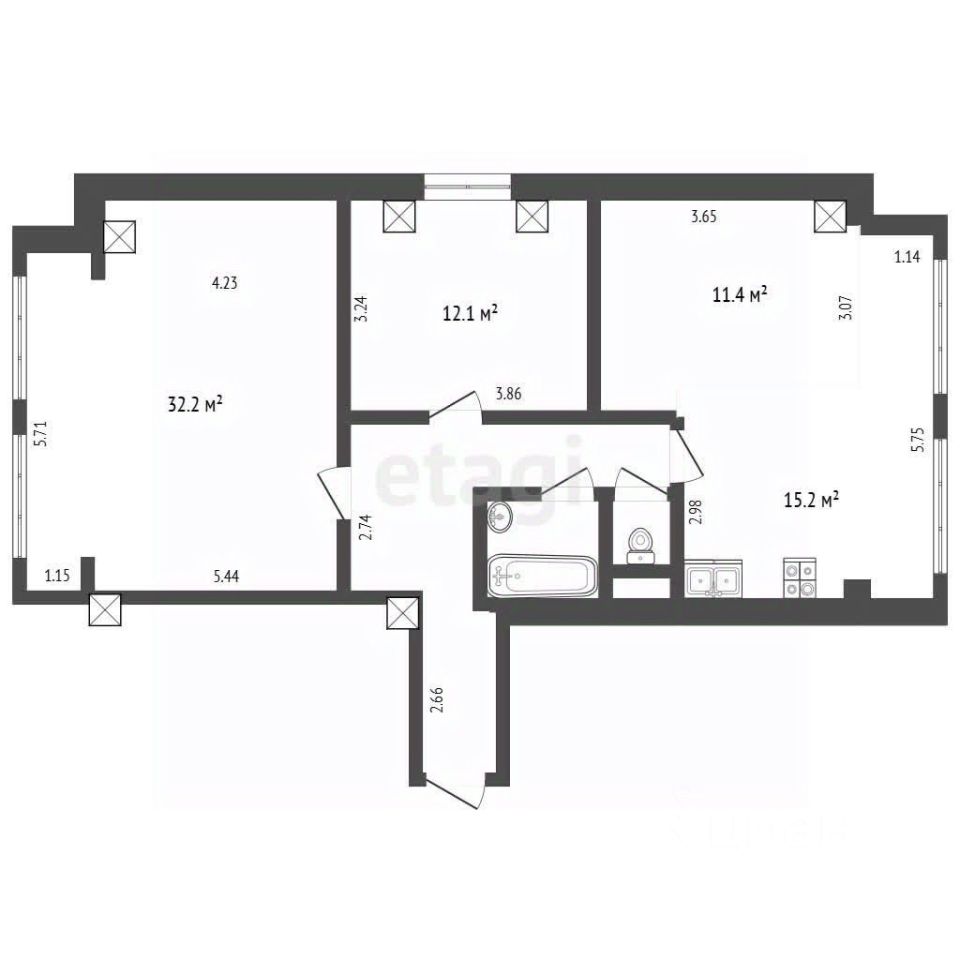 - раздельный санузел, где в ванной (2,7 кв. м) разместились и полноценная ванная с функцией джакузи, и большой умывальник с тумбой, и стиральная машина,