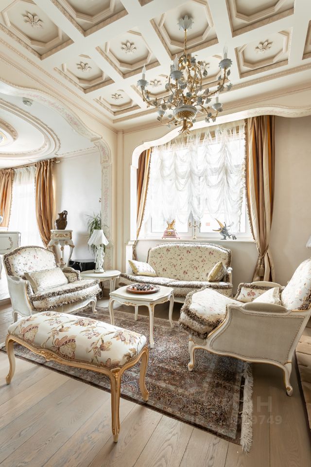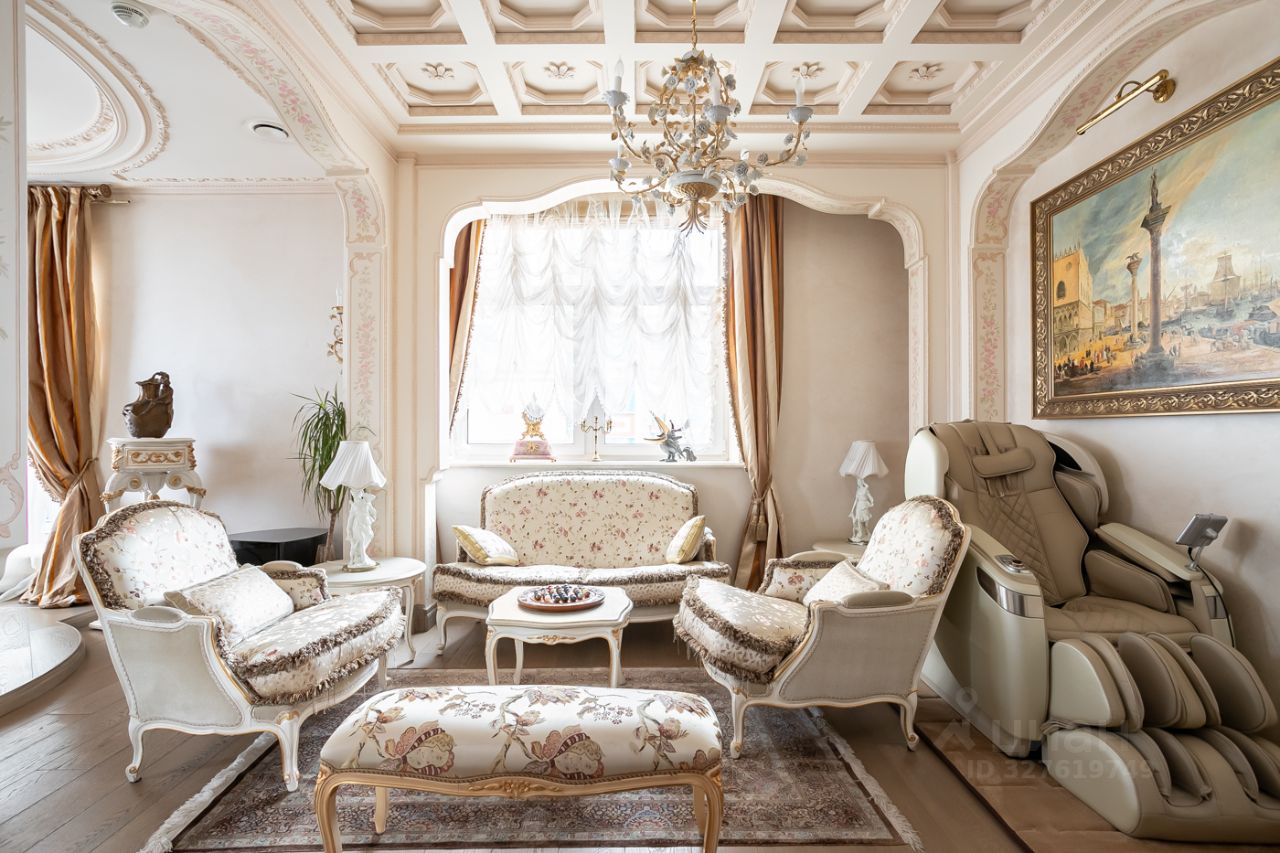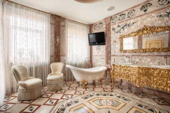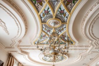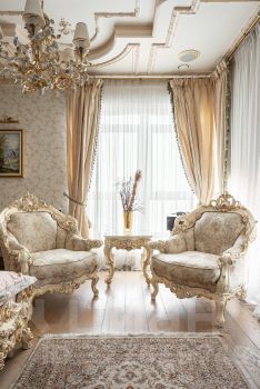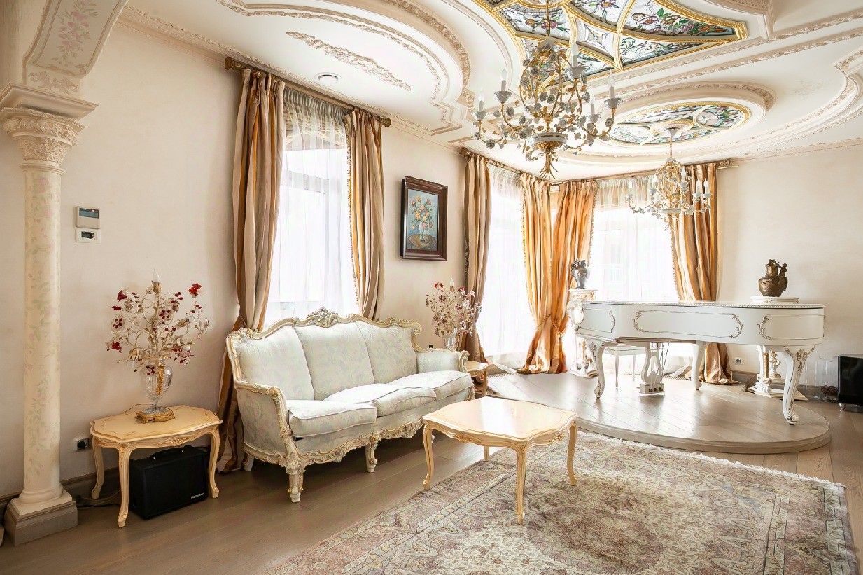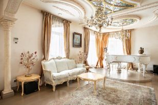 Теперь немного слов о наполнении этого уникального объекта. Вся мебель ручной работы, сантехника, текстиль и предметы интерьера изготовлены в единственном экземпляре, специально для данного проекта. Никакого евроремонта, искусственного глянца, пластика и других современных материалов. Скрупулёзный подход реализован при использовании в оформлении интерьера квартиры: натурального итальянского мрамора, ценных пород дерева, лепнины и витражного остекления на потолке.