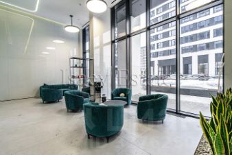 • Интерьеры лобби созданы по авторскому дизайн-проекту. С потолками до 8,7 м, окнами в пол, стойками ресепшн и мягкими зонами ожидания. Для жителей оборудованы фитнес-рум, детский клуб, лайнж и пространства для деловых встреч.
