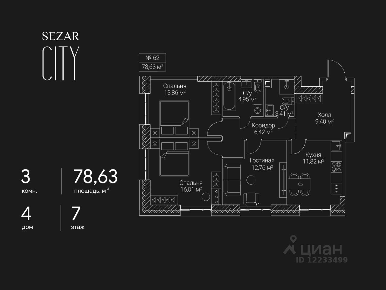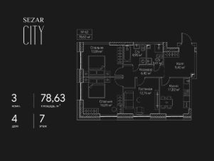 Продается 3-комнатная квартира в ЖК СЕЗАР СИТИ на 7 этаже. Общая площадь квартиры составляет 78,63 кв.м. Квартира без отделки. Срок сдачи - 2027 год.