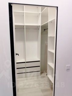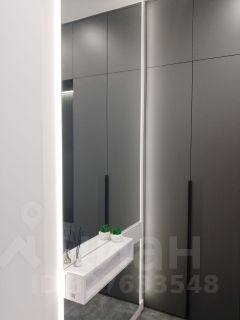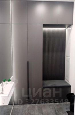При входе в квартиру нас встречает зеркало от потолка до пола с подсветкой по периметру и вместительный шкаф с мягким пуфом, далее следует гардеробная с множеством шкафов для хранения.