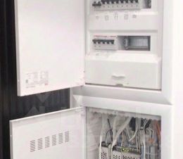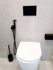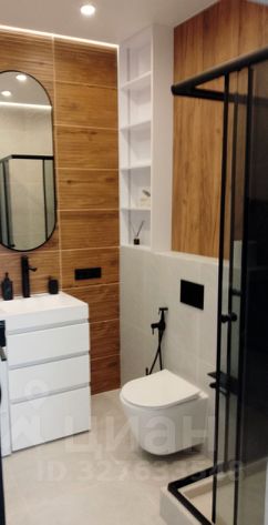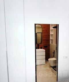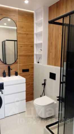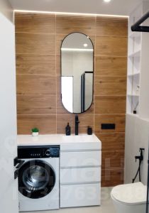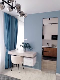 Кухню-гостиную и спальню разделяет высокая интерьерная дверь. В спальне находятся большая кровать, прикроватные тумбочки и столик-бьюти около зеркала с удобным мягким креслом. Для большего комфорта в комнате установлен кондиционер. Санузел с душевой кабиной, которая гармонично вписывается в общий стиль санузла, который отделан натуральными материалами, природных оттенков, оборудован системой инсталляции, гигиеническим душем, зеркалом, стиральной машиной и декоративными шкафчиками .