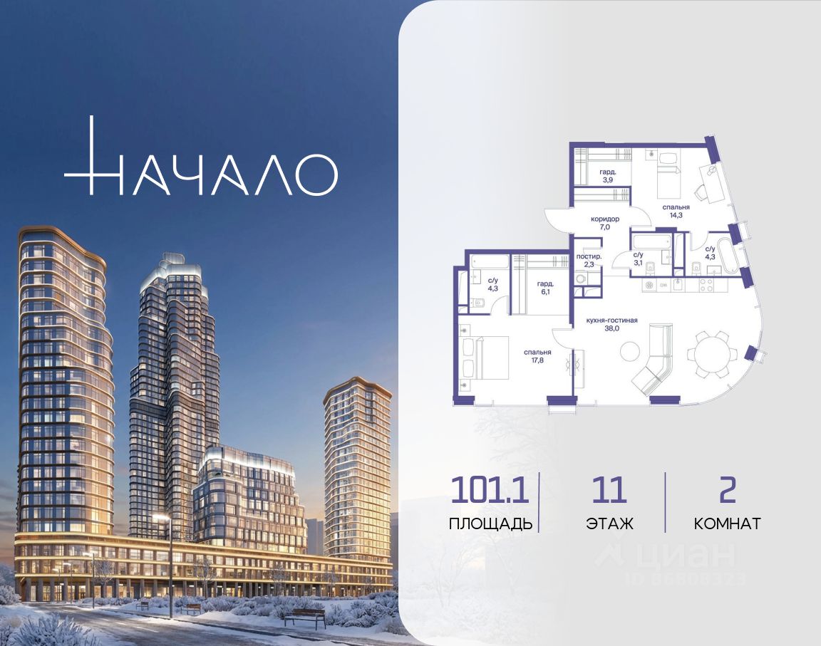 В престижном районе Пресня, на перекрестке делового и исторического центров Москвы, продается двухкомнатная квартира площадью 101.10 кв. м без отделки. Квартира находится на 11 этаже 11-этажного дома, в новом элитном жилом комплексе "Начало" от девелопера "Донстрой". Реализация проекта запланирована на 1 квартал 2030 года.