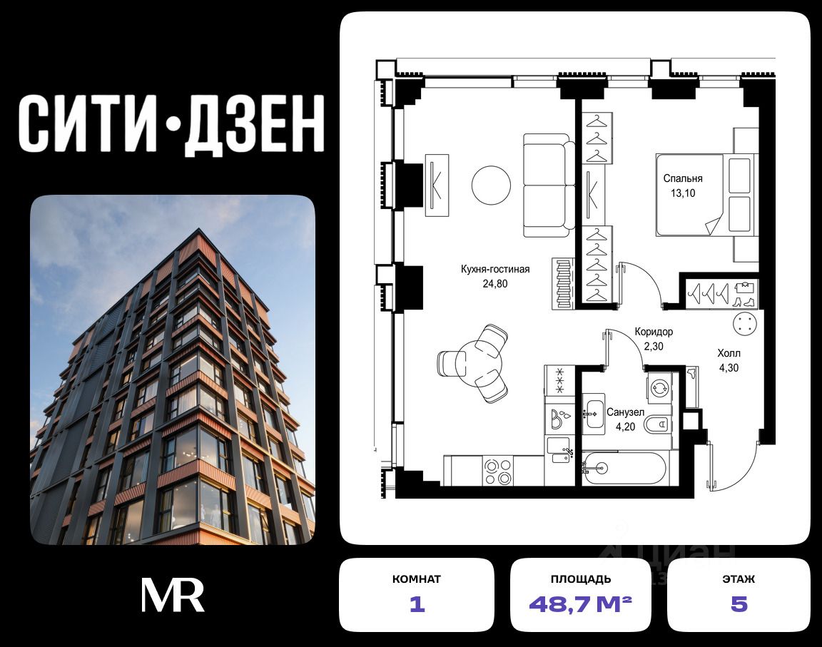 Продается 1-комнатная квартира от застройщика в жилом мультиквартале СИТИДЗЕН на 5-м этаже в корпусе #2. Общая площадь лота составляет 48.70 м²