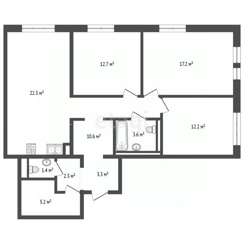 В продажу поступает квартира общей площадью 90,2 кв. м. с косметическим ремонтом. Планировка включает три изолированные комнаты, просторную кухню-гостиную площадью 22,3 кв. м. и два санузла. Дополнительным преимуществом является гардеробная комната 5,2 кв. м. Высота потолков 2,68 метра, установлены современные стеклопакеты. Окна выходят на две стороны — во двор и на улицу Левел Амурская, обеспечивая хорошую инсоляцию и проветривание.